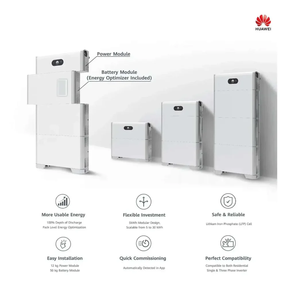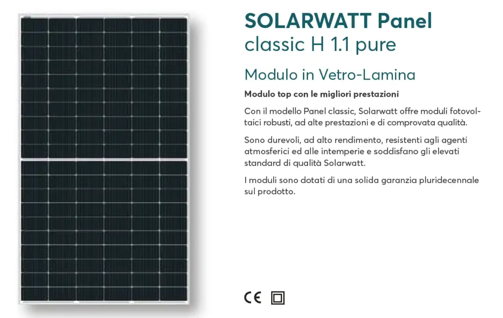 L’impianto viene realizzato con 2 inverter ibridi trifase Huawei Sun2000-8ktl-M1 installati in modalità master-slave, un pacco batterie LUNA2000-5KW-EO gestito dall’apposito BMS e da 37 moduli fotovoltaici Solarwatt PC H1.1 pure 410Wp e una colonnina di ricarica per veicoli elettrici Gewiss GWJ3113A.